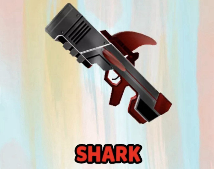 - Его дизайн вдохновлён лимитированным снаряжением Roblox Land Shark Shooter, но с изменённой цветовой схемой — серебристые, чёрные и красные акценты, а также distinctive красные плавники на стволе и цевье.