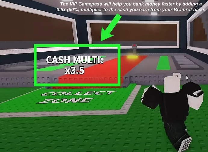 Фокусируйся на дорогих Brainrot, так как твой заработок умножается. Каждый доллар, который зарабатываешь, получает бонус 50%, поэтому приоритет редким и секретным Брейнротам, а не обычным. VIP-бонус делает фарм дорогих Brainrot намного эффективнее.