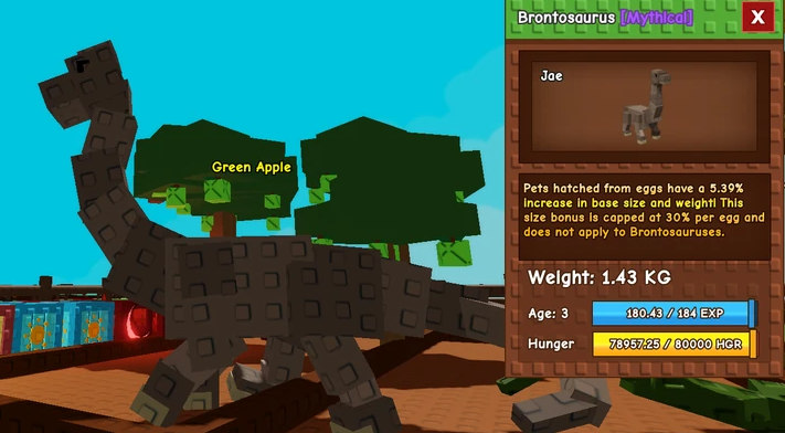Бронтозавр — это питомец мифической редкости (1% шанс вылупления), представленный в «Доисторическом Обновлении». Ценится за свою уникальную способность увеличивать размер, это второй по редкости динозавр после Божественного Ти-Рекса. В отличие от динозавров, ориентированных на бой, Бронтозавр специализируется на увеличении долгосрочной ценности вашей коллекции питомцев.
