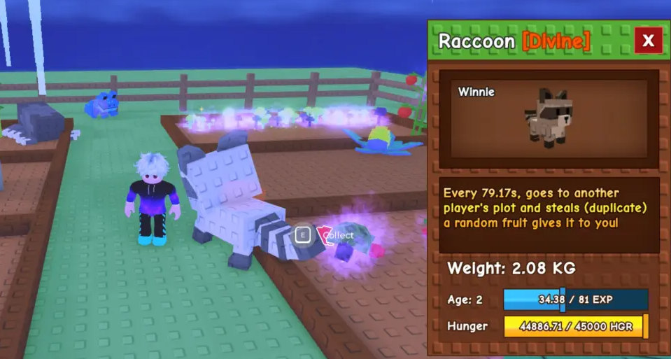 Енот (Raccoon) — питомец высшего уровня, стоящий потраченных усилий. Сосредоточьтесь на фарме Лунных Очков во время событий, вылупляйте несколько Лунных Яиц (цельтесь в 10+ для противодействия шансу в 1%) и размещайте свой сад рядом с элитными игроками. Получив Енота, вы обеспечите себе пассивный поток эндгеймных фруктов — это необходимо для серьёзных садоводов!