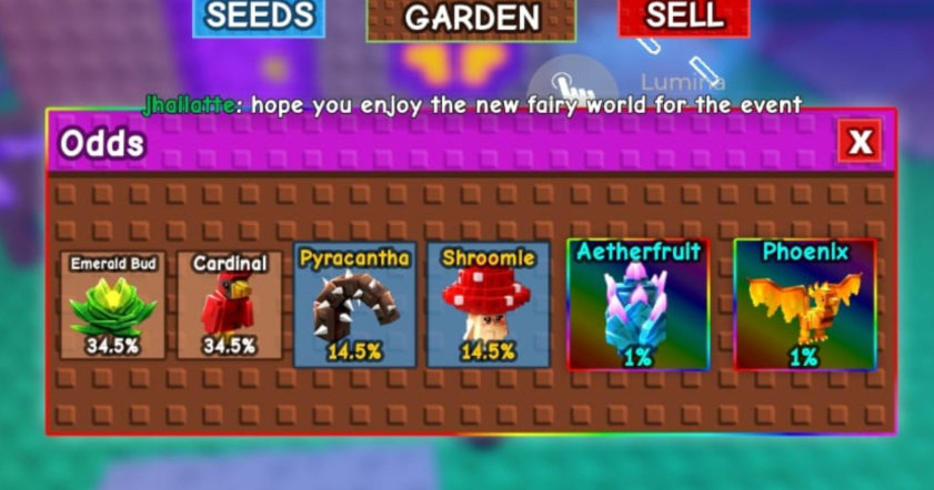 | Зачарованный сундук (Enchanted Chest) | 1% | — Сдавайте Светлячковые банки (Fairy Jars) NPC Лумине. — Купите за 25,000 Феерических очков. — Скрафтите используя 1 Солнечную луковицу (Sunbulb), 1 Зачарованный набор семян (Enchanted Seed Pack), 1 Зачарованное яйцо (Enchanted Egg) и 6,000 Феерических очков. |
