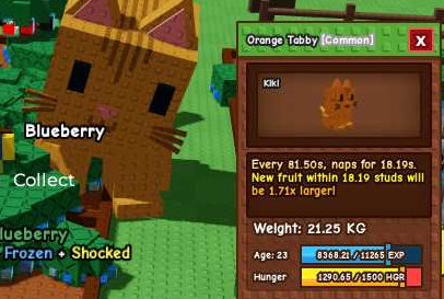 Этот редкий рыжий кот повышает прибыль сада, увеличивая размер фруктов во время сна. Основная механика:
