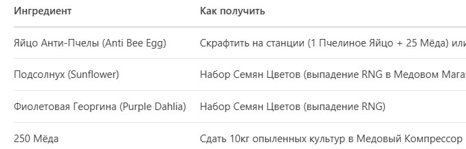 Проф совет: Фармите Наборы Семян Цветов во время ивентов «Рой Пчел» (ежечасно) для семян Подсолнуха/Фиолетовой Георгины — используйте культуры с многократным сбором (например, Бамбук) для максимальной эффективности сбора мёда.
