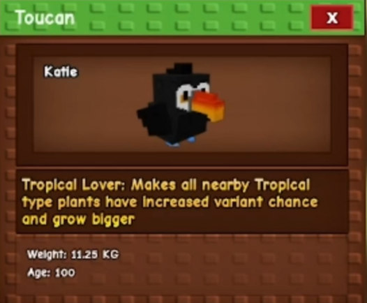 - Прокачка: Кормите Тукана Тропическими лакомствами (крафт из бананов) для ускорения прокачки. Каждый уровень увеличивает радиус ауры на 0.5%.