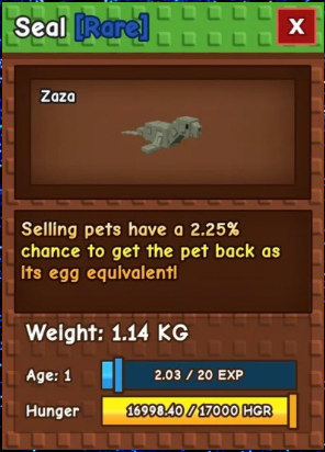 - Основная функция: При продаже ЛЮБОГО питомца, Тюлень имеет шанс 2.42% вернуть вам яйцо того же типа, из которого был вылуплен проданный питомец. Например, продажа Обезьяны (из Редкого яйца) может принести вам новое Редкое яйцо.