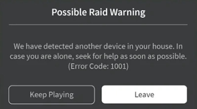 - Связь с хоррор-играми: Это сообщение появляется в психологической хоррор-игре «Start Survey» (также известной как «The Survey») как часть её механики запугивания. Оно гласит: «Возможное предупреждение о рейде. Мы обнаружили другое устройство в вашем доме. Если вы одни, немедленно позвоните в 911».