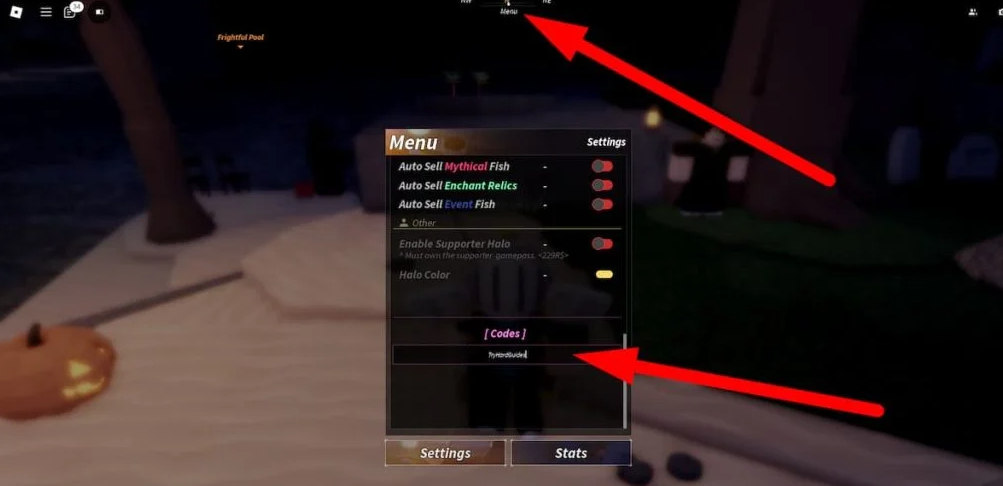 Сначала запустите Fisch из библиотеки игр Roblox и дождитесь полной загрузки. Когда вы окажетесь на причале с готовой удочкой, посмотрите на верхнюю часть экрана. Вы увидите кнопку с надписью «Menu» в панели интерфейса — нажмите на неё.