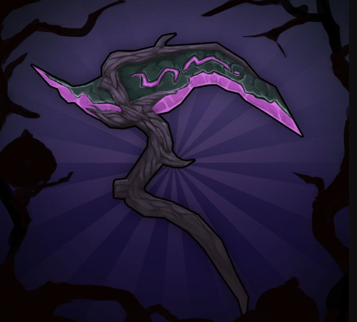 Коса из старого дерева — это нож Древней редкости (Ancient rarity) в ММ2, известный своим уникальным дизайном и редкостью. Его внешний вид напоминает древнее, искривлённое дерево с фиолетово-чёрным лезвием и фиолетовыми прожилками, что придает ему мистический и жутковатый вид, идеально подходящий для Хэллоуина 🎃. Рукоять сделана так, чтобы выглядеть как обветшавший ствол дерева, дополняя его сверхъестественную эстетику. Это оружие является частью набора Elderwood Set, который также включает в себя револьвер Elderwood Revolver, и очень ценится игроками за свой визуальный ряд и редкость.