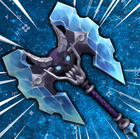- Лезвие: Головка топора выполнена в виде лабрис (двуглавого топора) с двумя лезвиями, заключенными в лёд, что придает ему морозный и смертоносный вид.