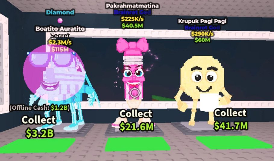 Агрессивно фармите кэш: Вам нужны огромные суммы денег, чтобы позволить себе новые Brainrot’ы. Начните с Krupuk Pagi Pagi за 60 миллионов, затем работайте над Boatito Auratito за 115 миллионов.