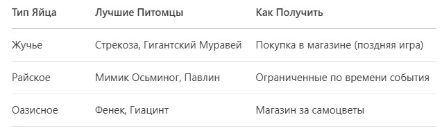 | Питомец | Тип Яйца | Ключевая особенность | Лучший случай использования |