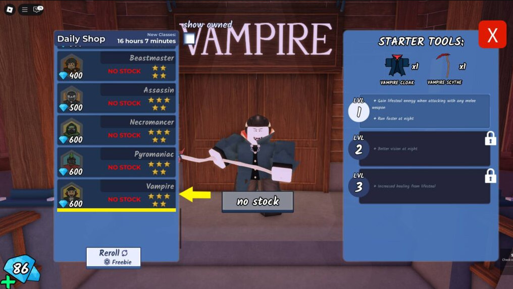 Вампир — это премиум класс, который стоит 600 алмазов для разблокировки в магазине классов в вашем лобби. В отличие от пассивных классов поддержки, таких как Медик или Повар, этот кровожадный боец вознаграждает агрессивные стили игры способностями самоисцеления, которые могут переломить ход битвы.